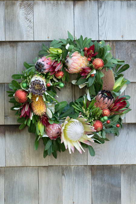 14 inch grapevine wreath with 8 fresh protea blooms and holiday ornaments. Price includes FedEx 2-Day delivery.