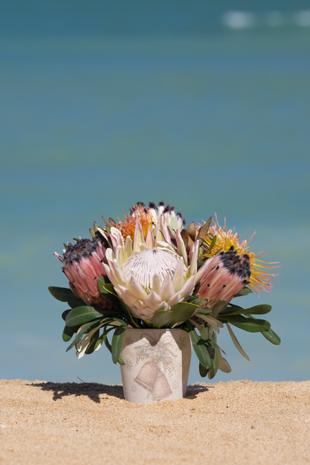 8 fresh protea arranged in a rustic holiday container.. Price includes 2-Day FedEx Express shipping.